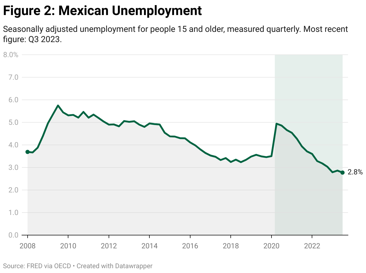 In the short run, unemployment has followed a similar pattern. At the height of the COVID-19 pandemic, unemployment reached nearly 5%. Recovery has been swift since then - by the third quarter of 2023, unemployment reached 2.8%, its lowest level in over two decades. Unemployment in Mexico appears to be cyclical rather than structural. Mexican policymakers should be more concerned with GDP growth and inflation.