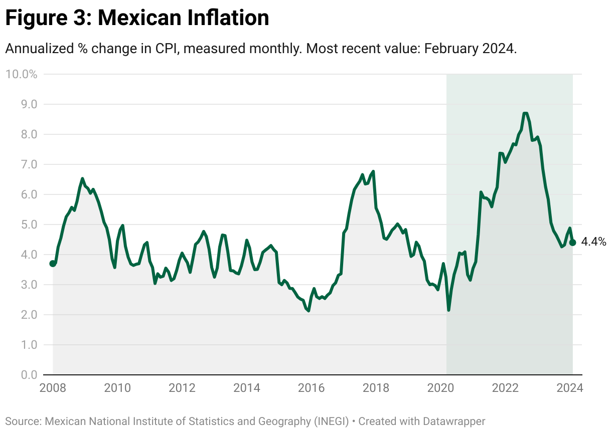 In the short run, Mexico has experienced its highest inflation since the 1990s. Inflation rose sharply from the beginning of the COVID-19 pandemic, reaching a peak of 8.7% in August of 2022. Since this peak, inflation has declined just as sharply. Last month, inflation stood at 4.4%. I believe Mexico's most recent inflation is demand-related.