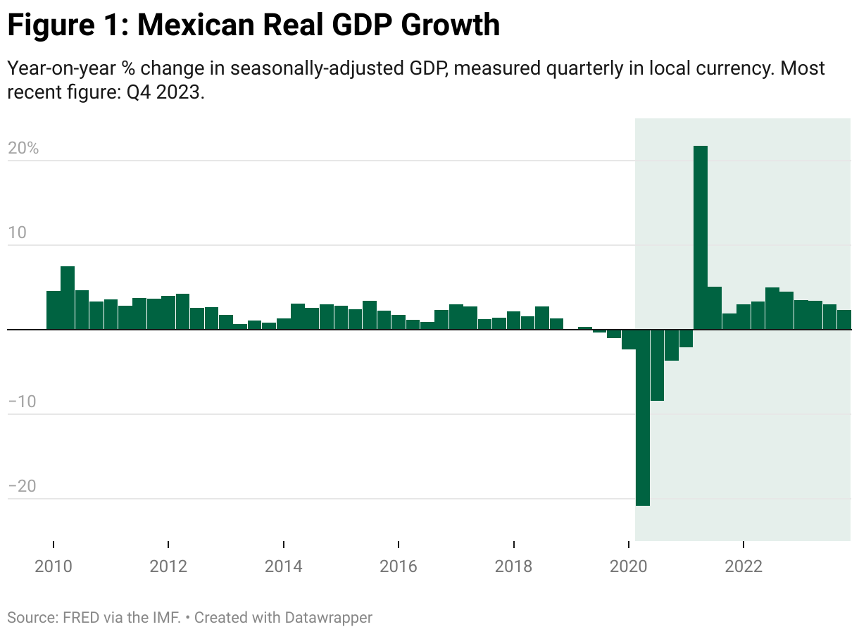 In the short run, Mexico's economy is still recovering from the COVID-19 pandemic. The pandemic was a massive shock to growth, which dropped to -20% in the second quarter of 2020. Mexico's economy shrank for the following three quarters. GDP growth spiked to nearly 22% in the second quarter of 2021 (this number is only this high because the COVID-related drop was so steep.) Since then, GDP growth has been consistently small but positive. GDP has grown at around 3% since COVID-19. Mexico's GDP reached pre-pandemic levels in the third quarter of 2022, slower than most Latin American economies. Recently, Mexico's, GDP growth has begun to decline. After a steep valley and peak due to COVID-19, Mexico appears to be returning to its usual slow growth.
